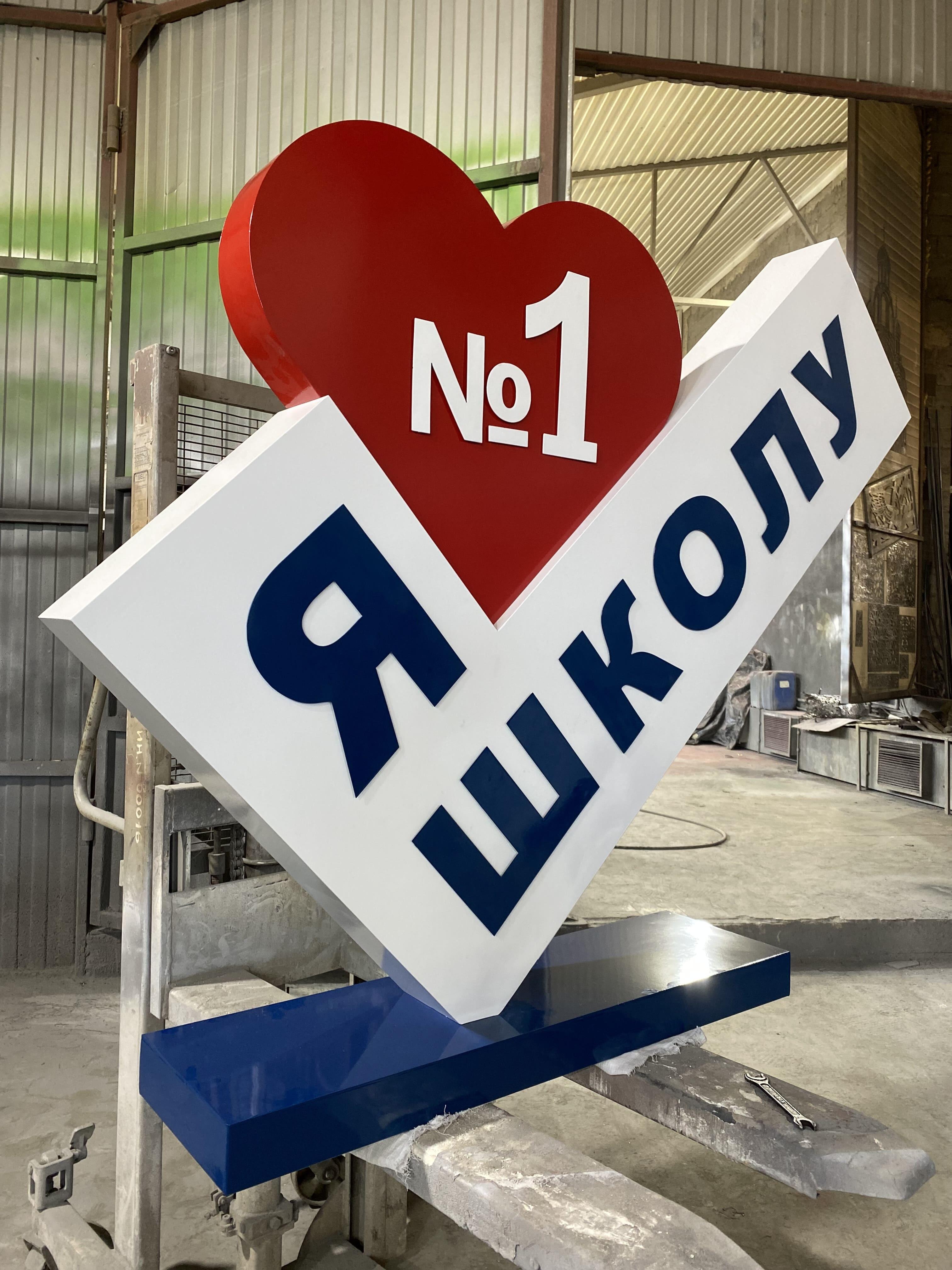 Надпись изготавливается из объемных световых или не световых букв из металла. Все зависит от степени воздействия на нее окружающих. Нужно рассчитывать нагрузки, которые будут применены к данной конструкции. Если данная стела будет стоять в проходном месте и на нее будут оказывать существенное воздействие, то ее нужно непременно делать из металла.
